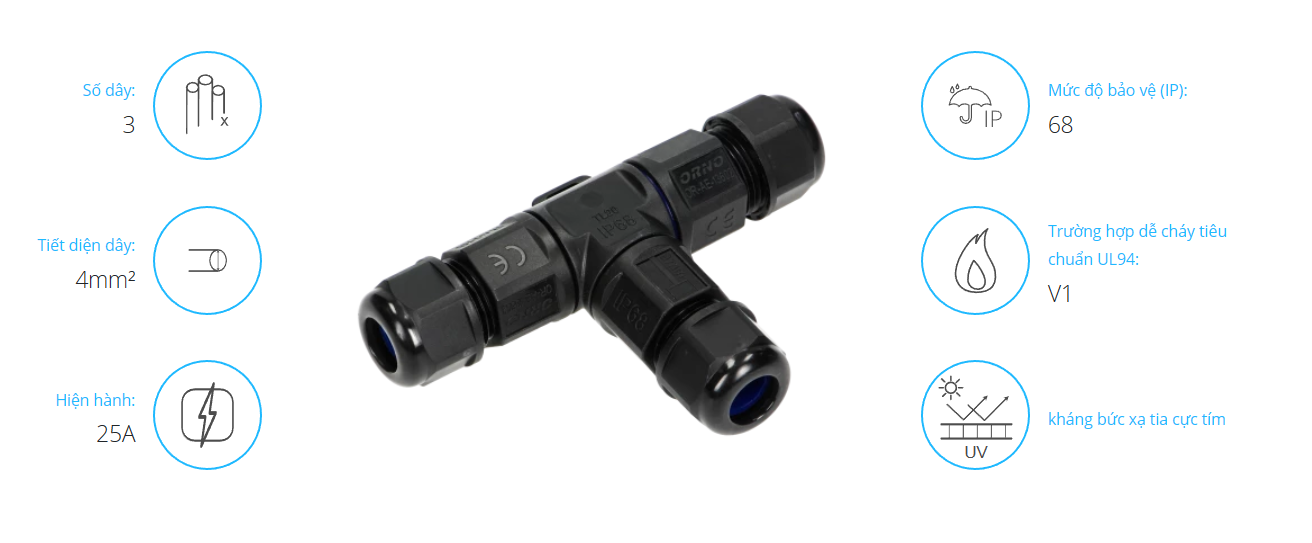 Cầu đấu nối chữ T OR-AE-13602 3 ngả cho dây điện đèn LED ngoài trời, 3X4mm2, 450V/25A, IP68 - Linh kiện đèn led Zalaa