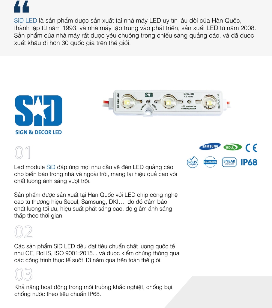 Led module SiD là dòng sản phẩm được sử dụng rất phổ biến trong ngành công nghiệp quảng cáo. Với kết cấu gồm các chip led được tích hợp trực tiếp lên bề mạch in (PCB), với vỏ bảo vệ bằng nhựa, led module thường có khả năng chống chọi cao với các điều kiện môi trường tự nhiên.