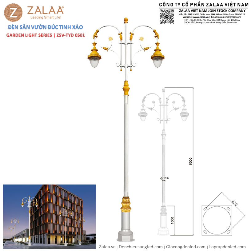Trong đó ZSV_TYD-0501 là Cột đèn sân vườn tân cổ điển dòng ZSV_TYD của ZALAA Lighting – hợp kim nhôm đúc, chống ăn mòn, chụp kính/PC, lắp LED, halide, sodium, nhận ODM/OEM dự án, phù hợp cảnh quan đô thị, biệt thự, công viên.