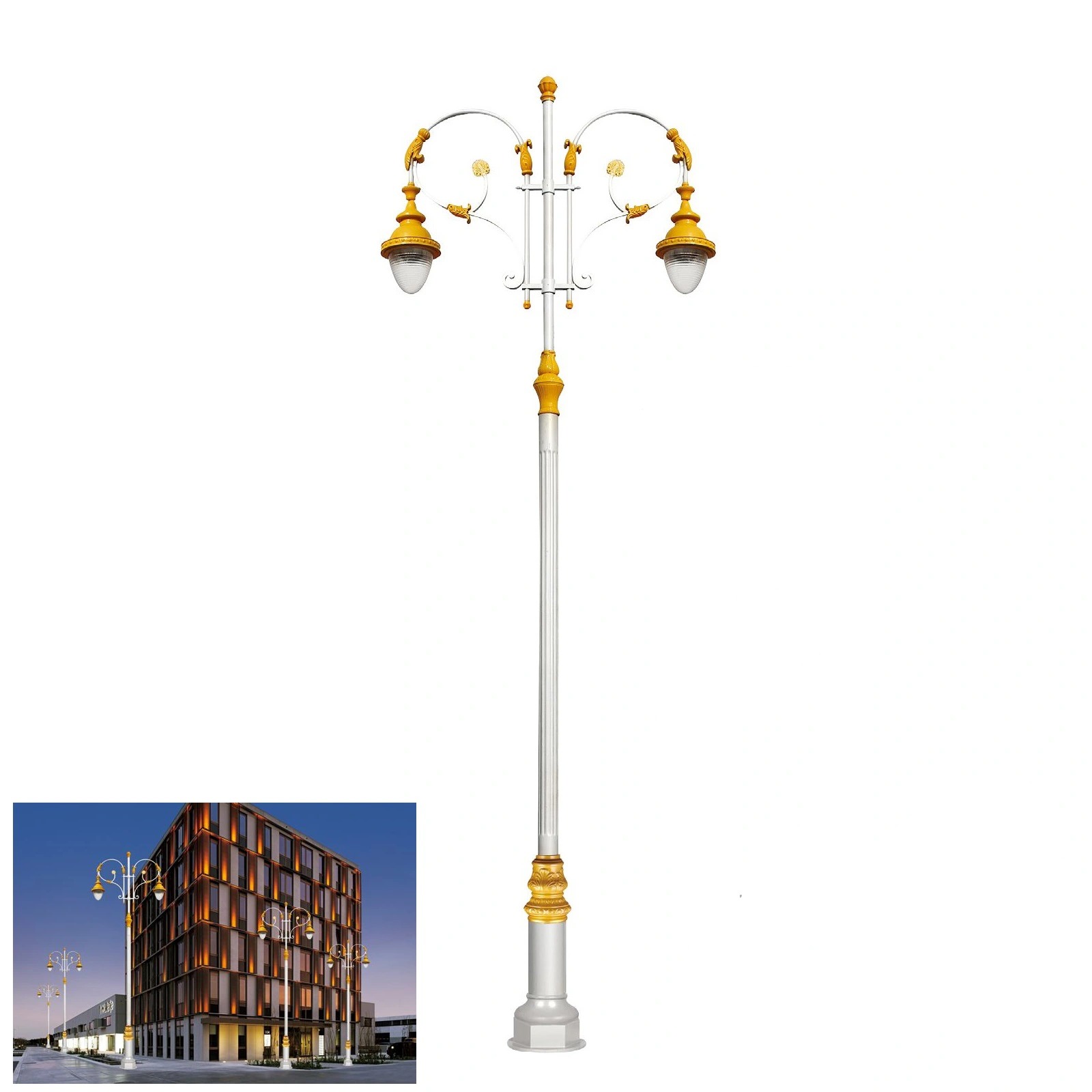 Cột đèn sân vườn tân cổ điển, thân trắng, họa tiết điểm vàng đồng ở các khớp nối và vỏ đèn, thiết kế nhiều tay đèn uốn cong mềm mại, phù hợp chiếu sáng cảnh quan, khu đô thị, công viên, lối đi bộ, biệt thự, khách sạn, resort ngoài trời.