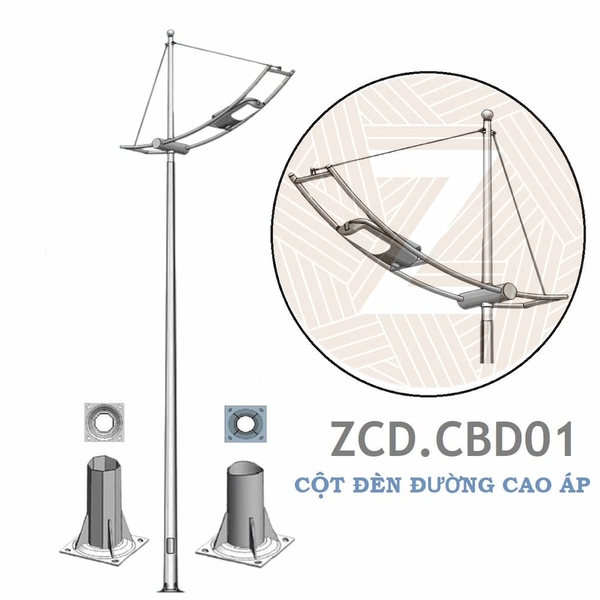Cột đèn cao áp cánh buồm ZCD.CBD01 làm bằng chất liệu thép, mạ kẽm nhúng nóng, sản xuất theo đúng tiêu chuẩn TCVN với kiểu dáng tròn côn hoặc bát giác cao từ 4-12m, là một trong những thiết bị chiếu sáng đường phố được sử dụng phổ biến hiện nay, thay thế các dòng cột điện bê tông trước đó.