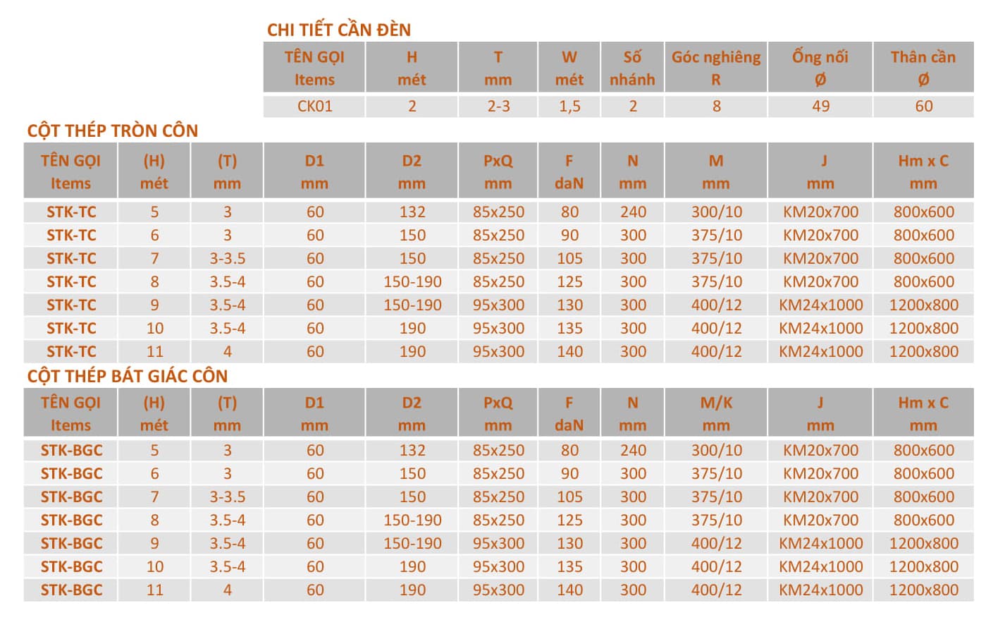 Cộng với giá cột theo báo giá chiều cao dưới đây: