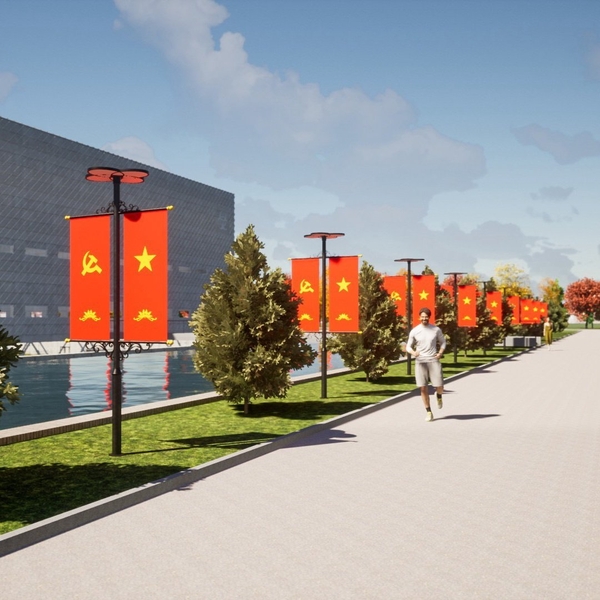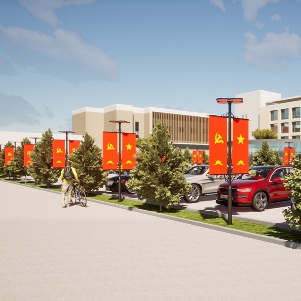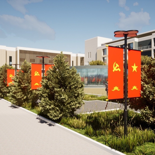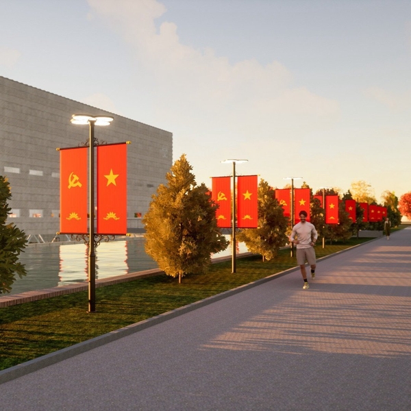 Bạn đang tìm Cột Đèn có phướn để treo băng rôn như quảng cáo, cờ đảng, cờ đỏ sao vàng...làm từ thép sơn tĩnh điện, màu theo yêu cầu. Đầu đèn LED 4 bóng công suất, Chiều cao và kích thước OEM sản xuất?