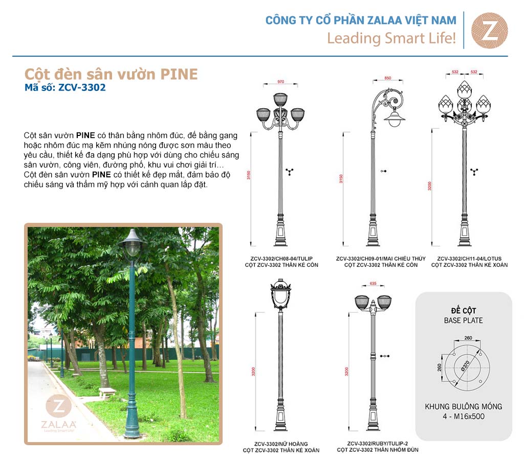 Cột sân vườn PINE có thân bằng nhôm đúc, đế bằng gang hoặc nhôm đúc mạ kẽm nhúng nóng được sơn màu theo yêu cầu, thiết kế đa dạng phù hợp với dùng cho chiếu sáng sân vườn, công viên, đường phố, khu vui chơi giải trí… Cột đèn sân vườn PINE có thiết kế đẹp mắt, đảm bảo độ chiếu sáng và thẩm mỹ hợp với cảnh quan lắp đặt.
