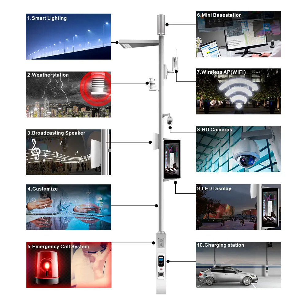 Mang theo nhiều thiết bị như: Năng lượng mặt trời lai, Đèn chiếu sáng thông minh năng lượng mặt trời, Cuộc gọi khẩn cấp qua loa công cộng, Trạm sạc, Camera HD, Đài phát thanh thành phố...