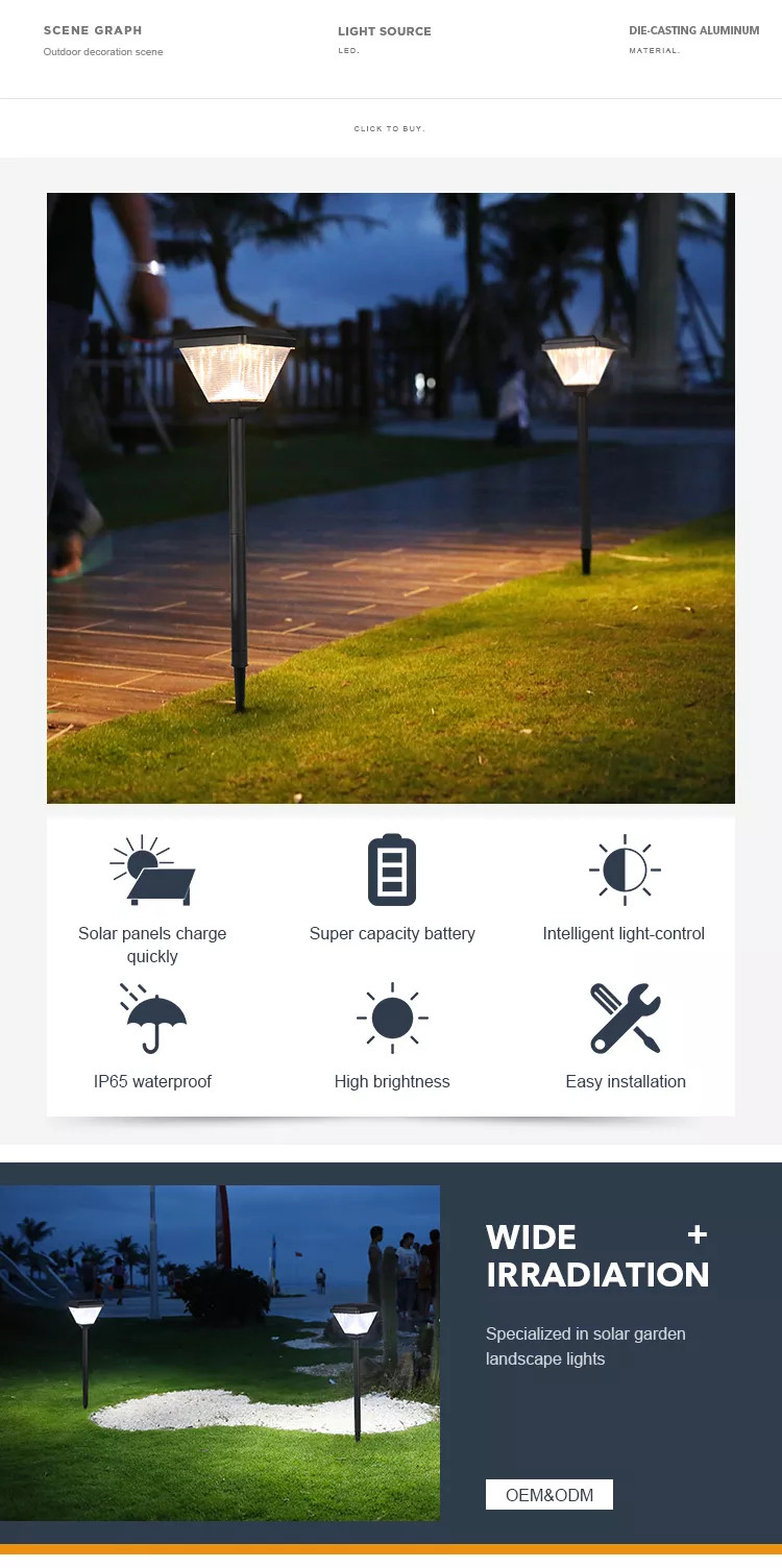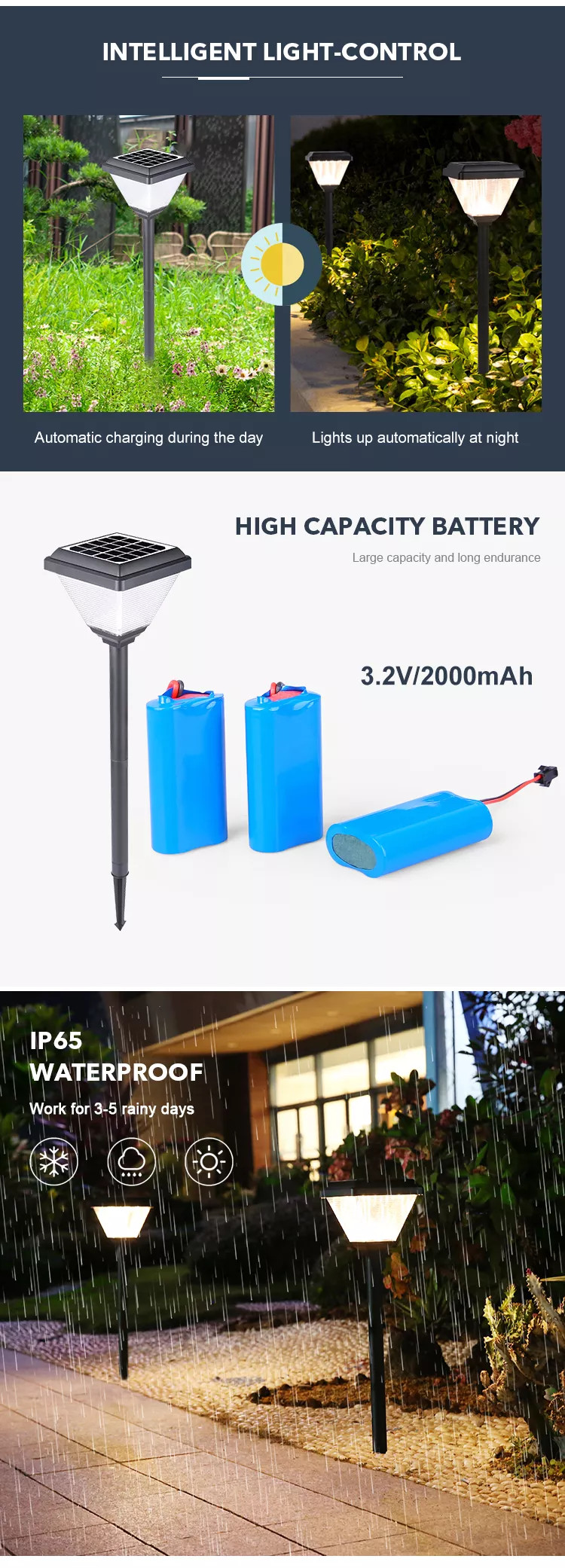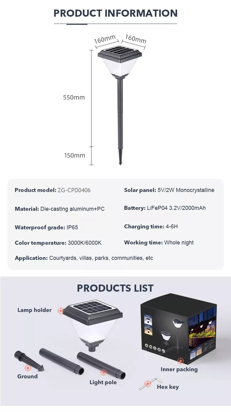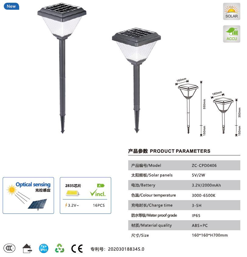 ZG-CPD0406 là mẫu đèn cắm cỏ sân vườn, cắm hàng rào, trang trí bãi cỏ,...thông minh hiện đại IP65, Sử dụng năng lượng mặt trời để chiếu sáng trang trí các không gian như cảnh quan đường đi, bãi cỏ ngoại thất tòa nhà, Biệt thự nhà vườn, Villa nghỉ dưỡng, Shophouse hiện đại, Homestay cao cấp, vv...Công Suất Tấm Pin/Đèn 5V/2W-Mono, Pin: 3.2V/2000mAh LiFePO4.