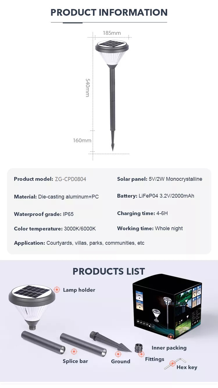 ZG-CPD0804 là mẫu Đèn LED cắm đất trang trí sân vườn, cắm cỏ chiếu sáng ngoài trời, thắp sáng bãi cỏ, ...thông minh hiện đại IP65, Sử dụng năng lượng mặt trời để chiếu sáng trang trí các không gian như cảnh quan đường đi, bãi cỏ ngoại thất tòa nhà, Biệt thự nhà vườn, Villa nghỉ dưỡng, Shophouse hiện đại, Homestay cao cấp, vv...Công Suất Tấm Pin/Đèn 5V/2W-Mono, Pin: 3.2V/2000mAh LiFePO4.
