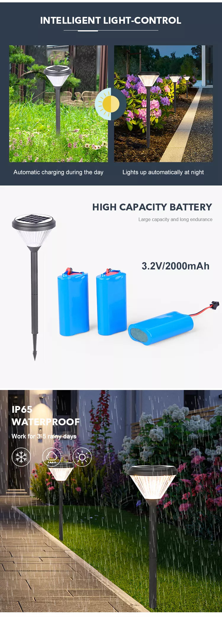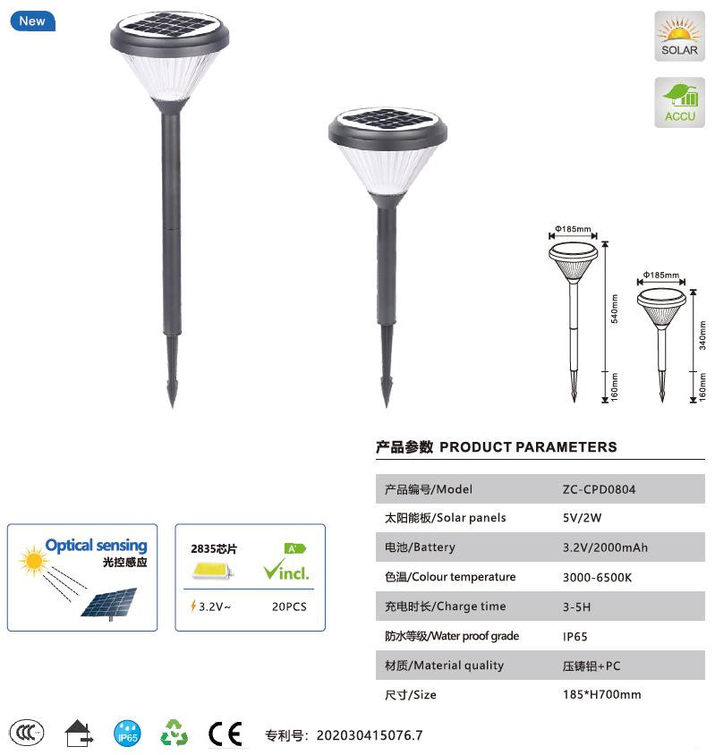 ZG-CPD0804 là mẫu Đèn LED cắm đất trang trí sân vườn, cắm cỏ chiếu sáng ngoài trời, thắp sáng bãi cỏ,...thông minh hiện đại IP65, Sử dụng năng lượng mặt trời để chiếu sáng trang trí các không gian như cảnh quan đường đi, bãi cỏ ngoại thất tòa nhà, Biệt thự nhà vườn, Villa nghỉ dưỡng, Shophouse hiện đại, Homestay cao cấp, vv...Công Suất Tấm Pin/Đèn 5V/2W-Mono, Pin: 3.2V/2000mAh LiFePO4.