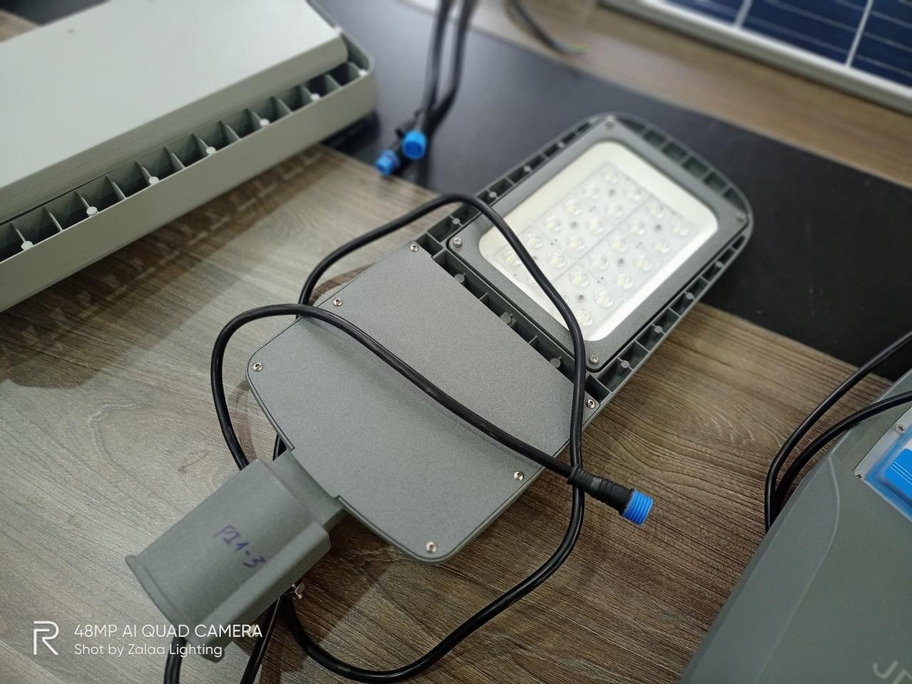 - Trong hệ thống điện năng lượng mặt trời còn có bộ lưu điện pin Lithium FePO4. Nó có dạng hình hộp chữ nhật, tính bền cơ học rất tốt. Vai trò của nó là dự trữ năng lượng cho toàn hệ thống, đảm bảo đèn có thể chiếu sáng trong ngày mưa bão. Nó có điện áp danh định là 12.8V. Dung lượng pin đạt 65AH.