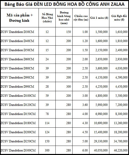 Mã Sản Phẩm ZCSV-Dandelion của ZALAA là một lựa chọn chiếu sáng ngoài trời đẹp và độc đáo giống như một bông hoa bồ công anh. Những bông hoa bồ công anh này được làm từ thép, sợi thủy tinh và đèn LED, phù hợp để sử dụng trang trí chiếu sáng dự án ngoài trời, hoặc trong nhà, công viên và các không gian công cộng khác. ZALAA có nhiều kích cỡ khác nhau, đường kính từ 30 cm đến 300 cm và có cả tùy chọn thay đổi màu đơn và màu RGB. Dưới đây là bảng báo giá tham khảo