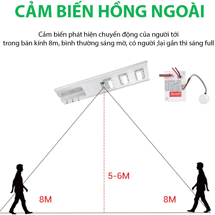Đèn sẽ tự động bật sáng khi trời tối và tự tắt vào ban ngày. Vào ban đêm khi có người đi qua đèn cảm biến của đèn sẽ nhận dạng và sáng với 100% công suất, khi người rời khỏi khu vực cảm biến đèn sẽ giảm sáng xuống còn 30% để tiết kiệm điện năng