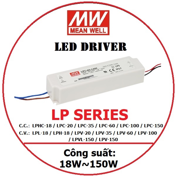 Nguồn Đèn LED Driver Meanwell LP, công suất từ 18W~150W, Model C.V. C.C. Thích hợp cho các ứng dụng chiếu sáng LED và biển báo chuyển động tiết kiệm. Liên hệ tư vấn thêm...