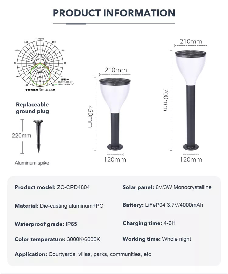 ZG-CPD4804 là mẫu trụ đèn led, nấm sân vườn, cột đèn thấp IP65, Sử dụng năng lượng mặt trời để chiếu sáng trang trí các không gian như cảnh quan đường đi, bãi cỏ ngoại thất tòa nhà, Biệt thự nhà vườn, Villa nghỉ dưỡng, Shophouse hiện đại, Homestay cao cấp, vv...Công Suất Tấm Pin/Đèn 6V/3W-Mono, Pin:3.7V/4000mAh. 𝙕𝘼𝙇𝘼𝘼 𝙎𝙤𝙡𝙖𝙧 𝙂𝙖𝙧𝙙𝙚𝙣 nhập khẩu và phân phối tại Việt Nam.